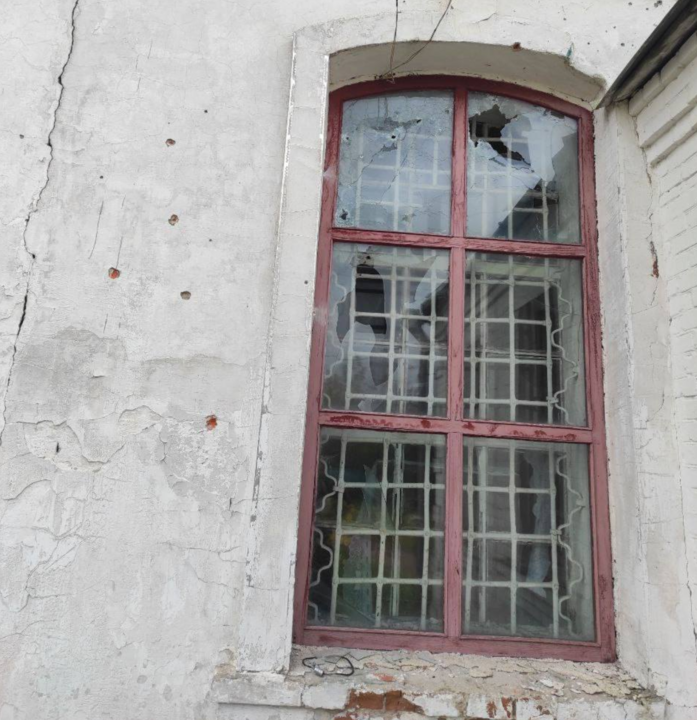 Повреждены стены церкви, выбиты окна, на территории храма образовалась воронка от снаряда.