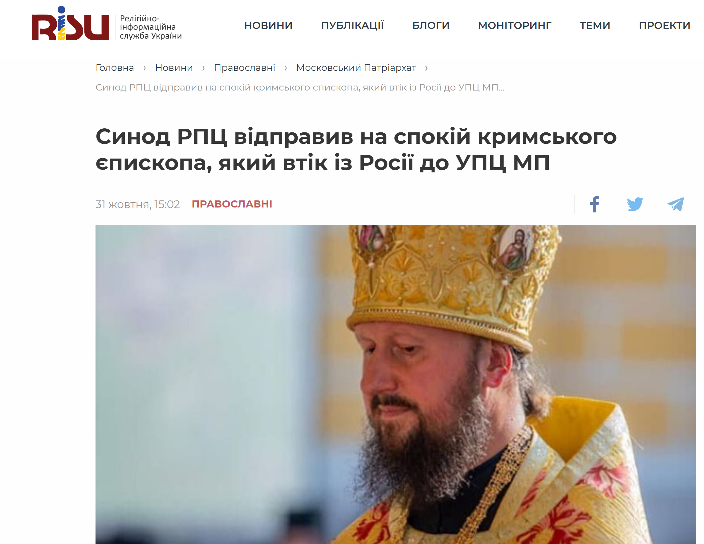 Униатский ресурс RISU опубликовал материал, в котором Крым назван частью Российской Федерации. В заголовке публикации, посвященной епископу Калиновскому Агафону (служившему до лета 2025 года в Крыму), журналисты сообщили, что он «убежал из России в УПЦ МП».