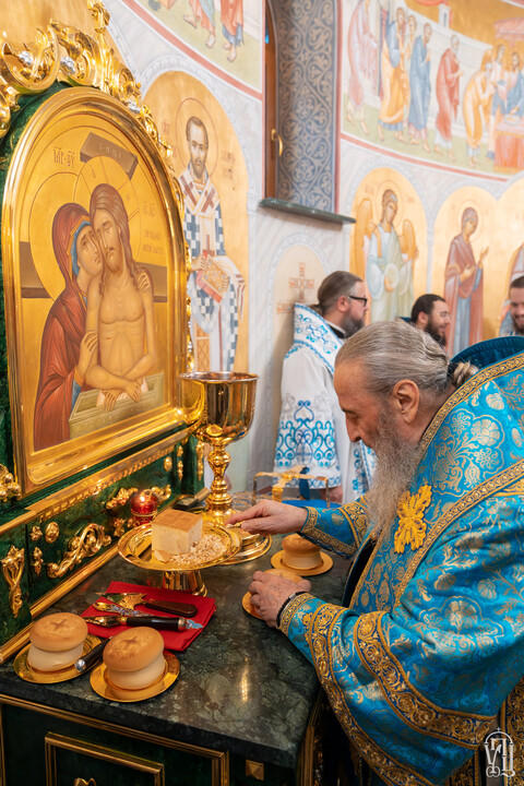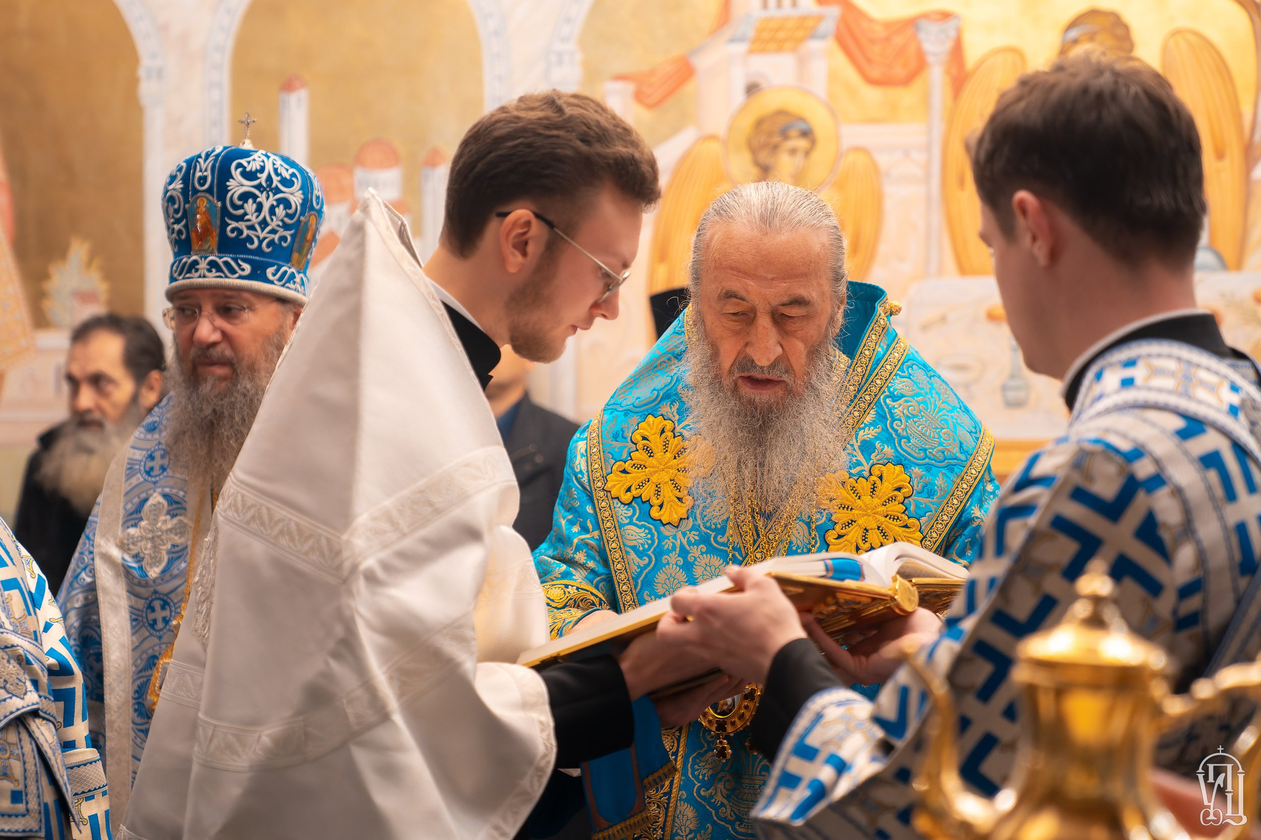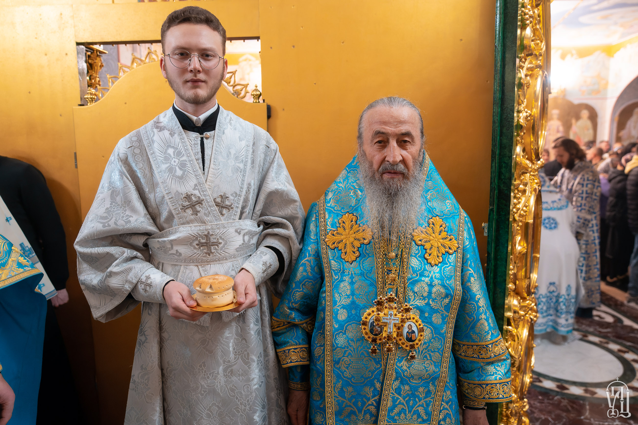 Предстоятелю сослужили управляющий делами УПЦ митрополит Бориспольский и Броварской Антоний, архиепископ Белогородский Сильвестр, архиепископ Ирпенский Лавр, архиепископ Бородянский Марк, епископ Гостомельский Аркадий, епископ Боровский Климент, духовенство храмового комплекса и гости в священном сане.