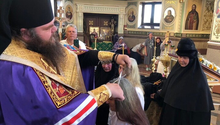 Новопостриженная монахиня и три новых инокини получили имена в честь святых жен-мироносиц Марии Магдалины, Марфы, Саломии и Сусанны.