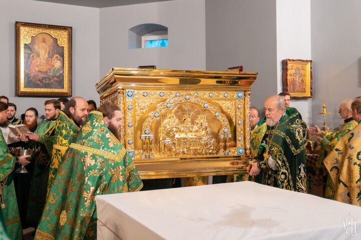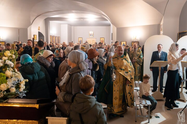 Освященный храм является нижним храмом в комплексе Благовещенского собора в районе Святошино. После совершения чина великого освящения Предстоятель возглавил в новоосвященном храме Божественную литургию.