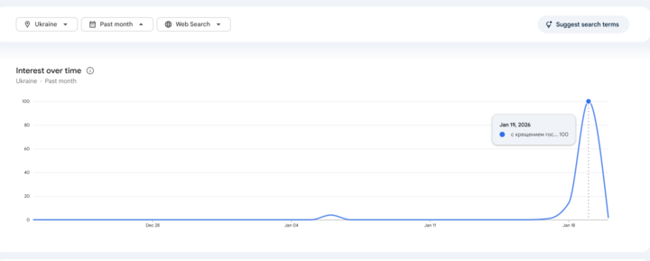 Украинцы в 2026 году продолжали отмечать Крещение Господне по старому стилю – 19 января. Об этом свидетельствуют, в частности, данные сервиса Google Trends.
