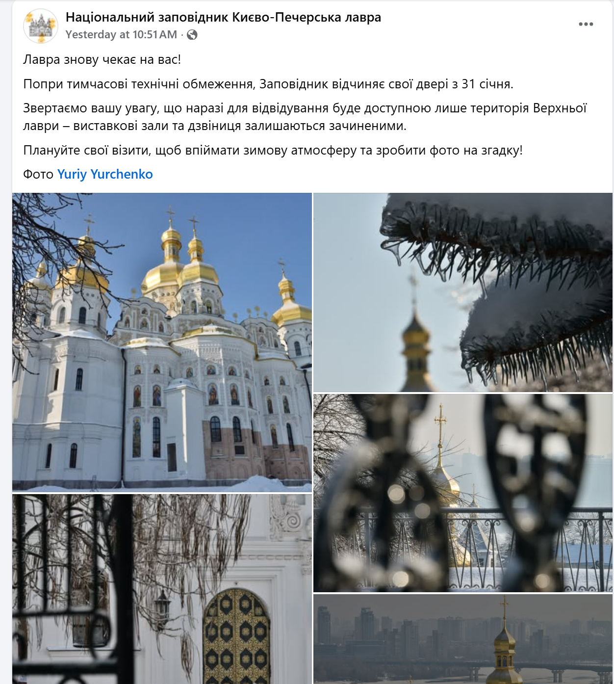 С 31 января 2026 года, после недели перерыва, заповедник частично возобновил доступ на территорию Верхней лавры. На странице в Фейсбуке ведомство опубликовало призыв к посетителям прийти в православную святыню на зимнюю фотоссесию.