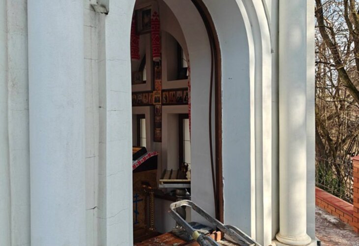 На опубликованных фотографиях видно рассыпанные осколки витража, выбитые окна и поврежденные двери. Здание часовни получило видимые разрушения как внутри, так и у входа.