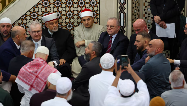 В крупнейшей мечети Сиднея премьера Австралии встретили неодобрительным свистом из-за его позиции по Ближнему Востоку, после чего он досрочно покинул мероприятие.