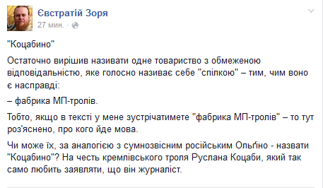 Чи може їх, за аналогією з сумнозвісним російським Ольґіно - назвати "Коцабино"? На честь кремлівського троля Руслана Коцаби, який так само любить заявляти, що він журналіст.