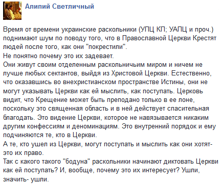 Они живут своим отделенным раскольничьим миром и ничем не лучше любых сектантов, выйдя из Христовой Церкви. Естественно, что оказавшись во внехристианском пространстве Истины, они не могут указывать Церкви как ей мыслить, как поступать. Церковь видит, что Крещение может быть преподано только в ее лоне, поскольку это священная область и в ней действует спасительная благодать. Это видение Церкви, которое не навязывается никаким другим конфессиям и деноминациям. Это внутренний порядок и ему подчиняются те, кто в Церкви.