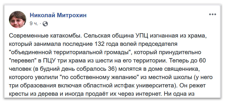 Сельская община УПЦ, изгнанная из храма, который занимала последние 132 года волей председателя «объединенной территориальной громады», который принудительно «перевел» в ПЦУ три храма из шести на его территории. Теперь до 60 человек (в будний день собралось 36) молятся в доме священника, которого уволили «по собственному желанию» из местной школы (у него три образования включая областной истфак университета). Он режет кресты из дерева и иногда продаёт их через интернет. Ни одна из нескольких десятков общин в регионе номинально перешедших в ПЦУ не исчезла. Ни один из священников не перешел в ПЦУ. Все судятся. Многие побеждают в судах. Ни одно судебное решение не исполняется. К священнику ходит социальная служба, грозит отнять субсидии на сына-инвалида, поскольку детская переделана в алтарь. Перед моим (и телегруппы местного православного полуподпольного телевидения) приездом на улице вырубили свет во всех домах.