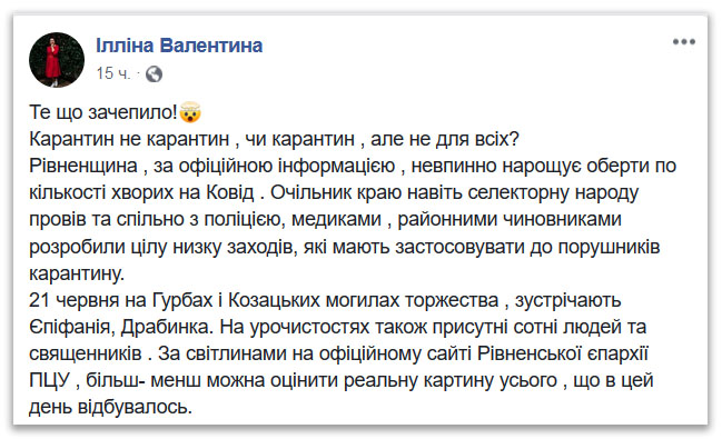 P.S. Я добре пам’ятаю події тримісячної давнини : тиждень до карантину і перший місяць життя у ньому. Тоді соціальні мережі , ЗМІ перетворились на активних мисливців за вірянами УПЦ, що ходили на молитву до церкви. Борці з ковідом їх відстежували та знімали, не втомлювались викликати правоохоронців під рівненські храми десятки разів за день, писати гнівні пасквілі і таврувати невгодну церкву з її послідовниками . А поміж тим , цифра хворих тоді була не настільки вражаюча як тепер!!!
