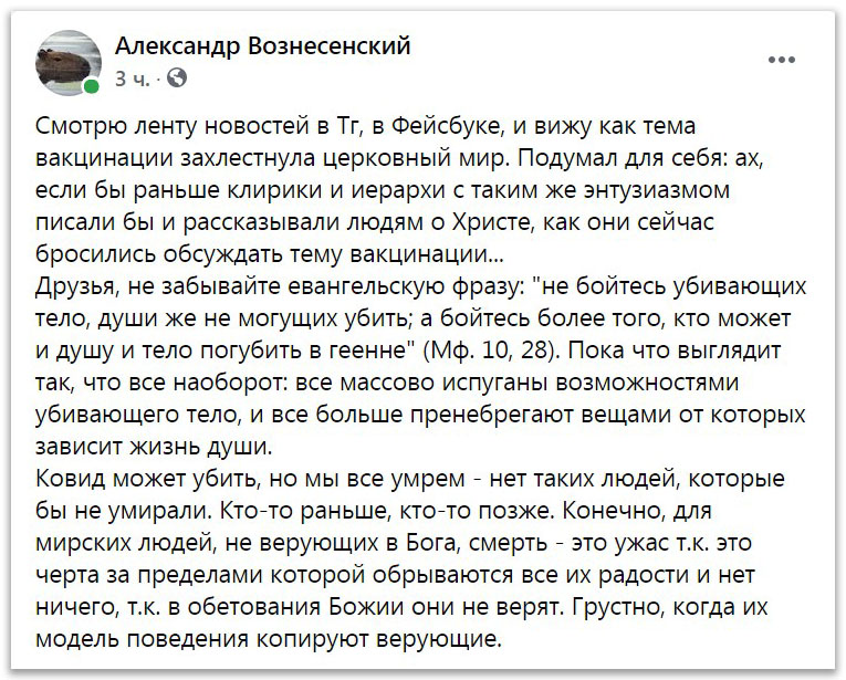 Подумал для себя: ах, если бы раньше клирики и иерархи с таким же энтузиазмом писали бы и рассказывали людям о Христе, как они сейчас бросились обсуждать тему вакцинации...
