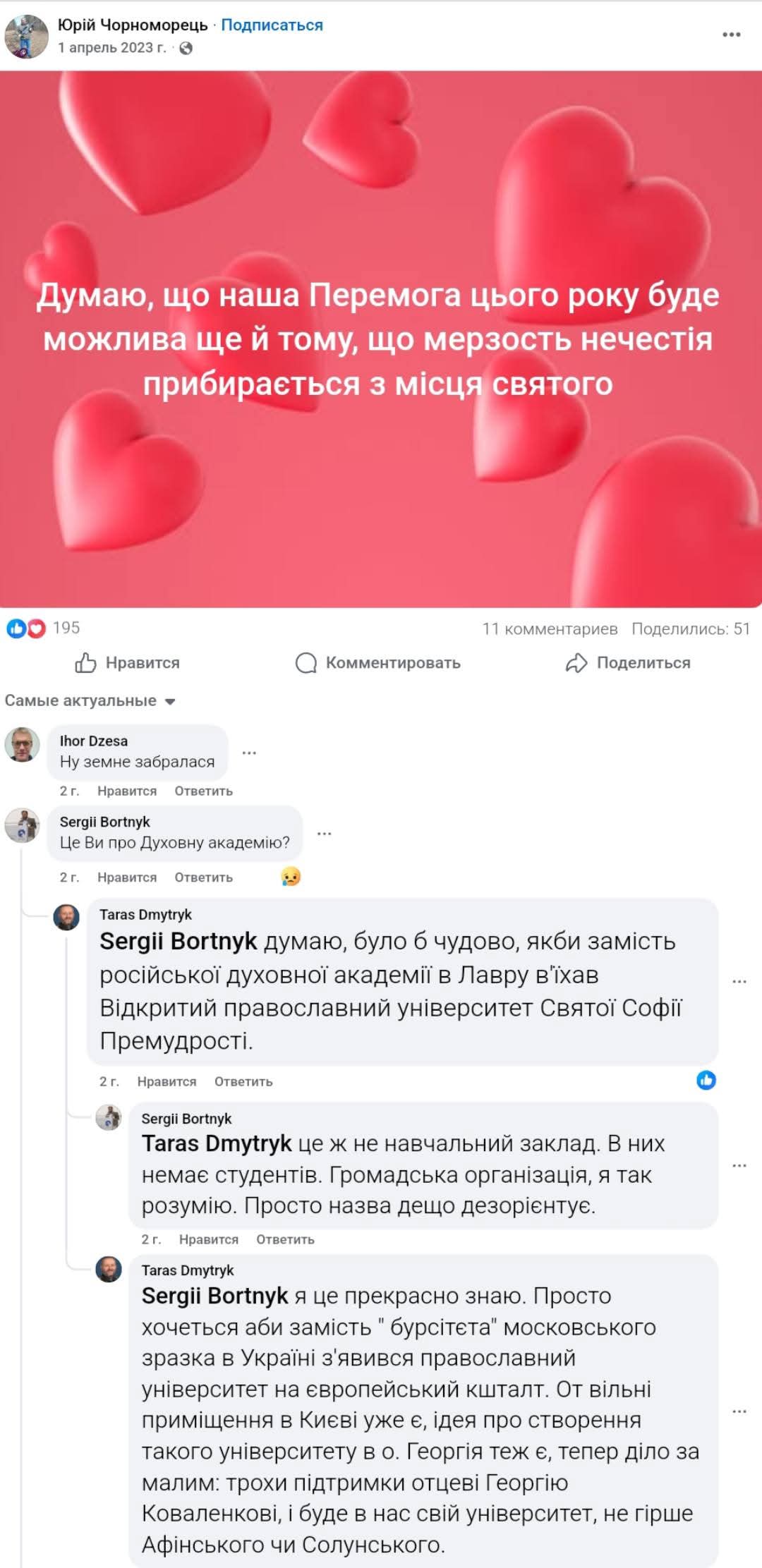 В комментариях друзья Юры тогда намечтали, что вместо КДАиС в Нижней Лавре вскоре появится на базе виртуального "Открытого православного университета" о. Георгия Коваленко (ПЦУ) православный богословский университет ПЦУ европейского образца - "не хуже Афинского или Фессалоникийского". Достаточно лишь предоставить о. Георгию небольшую поддержку.
