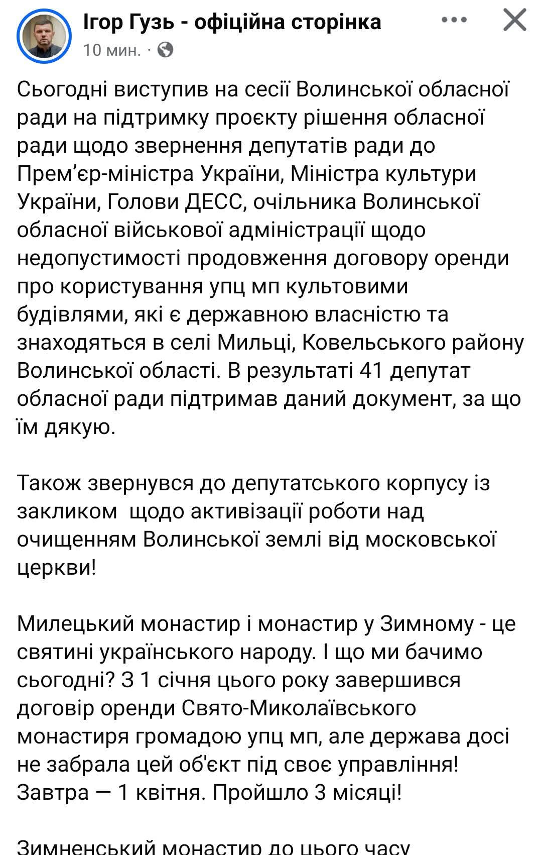 Говоря конкретно про Свято-Никольский Милецкий мужской монастырь, который в течение 30 лет возрождался монахами УПЦ и договор аренды с которым закончился 1 января (чиновники не решаются его продолжить), Гузь призвал депутатов не затягивать вопрос с переводом этого монастыря в ПЦУ. Как утверждает нардеп, когда монахи УПЦ будут выселены и монастырь будет передан ПЦУ, он станет "колыбелью украинского православия на Полесье", "центром паломничества", "духовным центром ПЦУ".