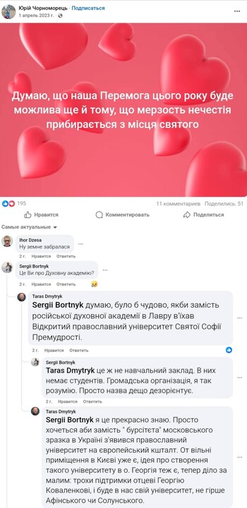 Три года назад (01.04.2023) "оружейный богослов" Юра Черноморец не скрывал своей радости по поводу того, что Министерство культуры в одностороннем порядке разорвало договор аренды с УПЦ об использовании помещений Нижней Лавры и все учреждения УПЦ (прежде всего Митрополия и Киевская Духовная Академия и Семинария) были вынуждены покинуть Киево-Печерскую Лавру. Украинскую Православную Церковь Юра назвал "мерзостью нечестия" и сделал пророчество, что поскольку учреждения УПЦ покидают Лавру ("мерзость нечестия убирается с места святого"), то уже в том же 2023 году Украина одержит победу в войне против России.