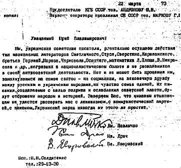 «Мы, украинские советские писатели, решительно осуждаем действия так называемых литераторов Светличного, Стуса, Черновола и др., погрязших в националистическом болоте и не раскаявшихся в своей антисоветской деятельности. Нет и не может быть прощения им, замахнувшимся на самое святое – на социализм, на вековечную дружбу между русским и украинским народами; на чувство семьи единой. Заверяем Вас, что никаким отщепенцам не удастся рассорить нас с ленинизмом, с Коммунистической партией, с законом. Украинский народ никогда им этого не простит».