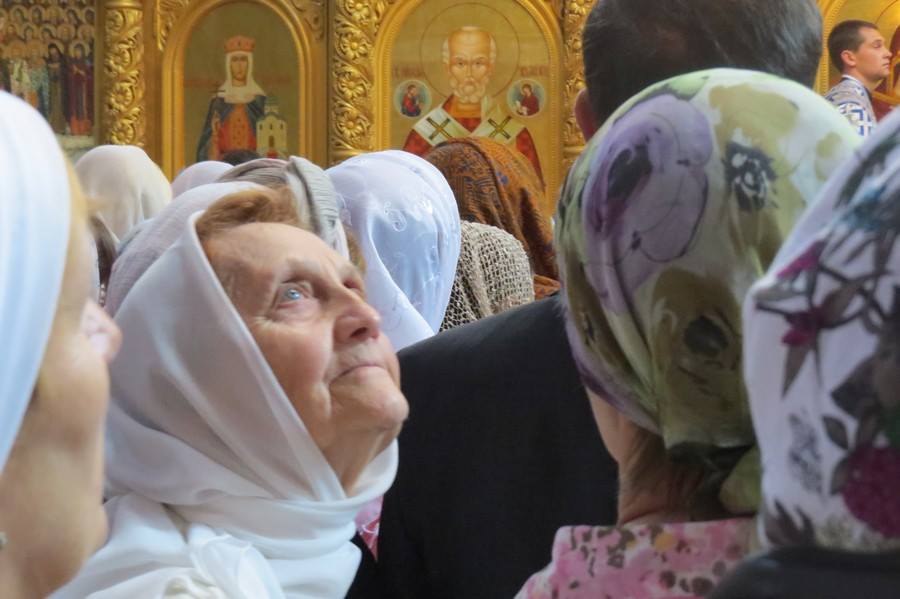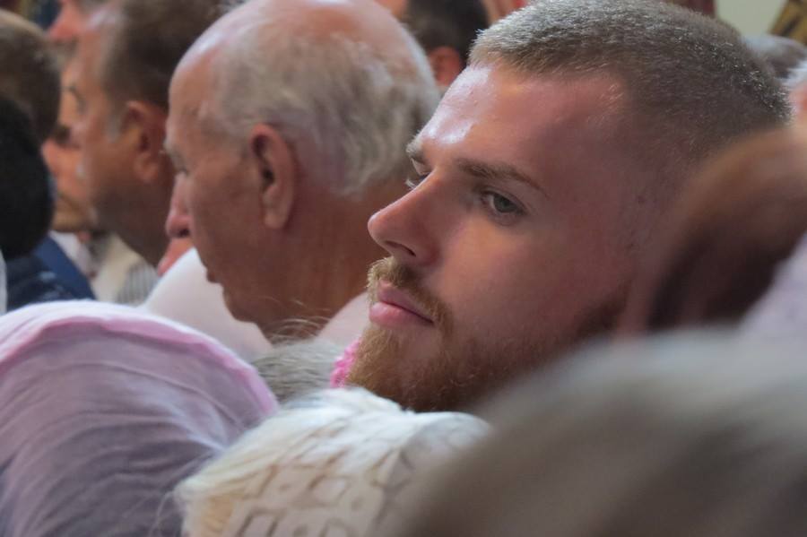 Але й з початком освячення народ у храм все прибував. Поспішали чоловіки різного віку, бабусі в хусточках та молоді жінки, що на ходу покривали голови. Як зазвичай на таких богослужіннях, людей у храмі – не проштовхнутися. Навіть руку для хресного знамення іноді важко підняти. І звичайно ж, і душно, і спекотно – літо все ж таки.