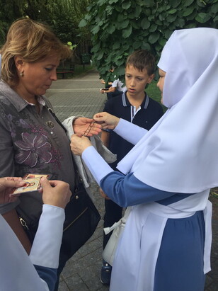 Після Літургії сестри Марфо-Маріїнської обителі пішли на послух в парк Слави поруч з Києво-Печерською лаврою. На озброєнні сестер – іконки Спасителя і Богородиці, і натільні хрестики, щоб дарувати їх усім бажаючим.