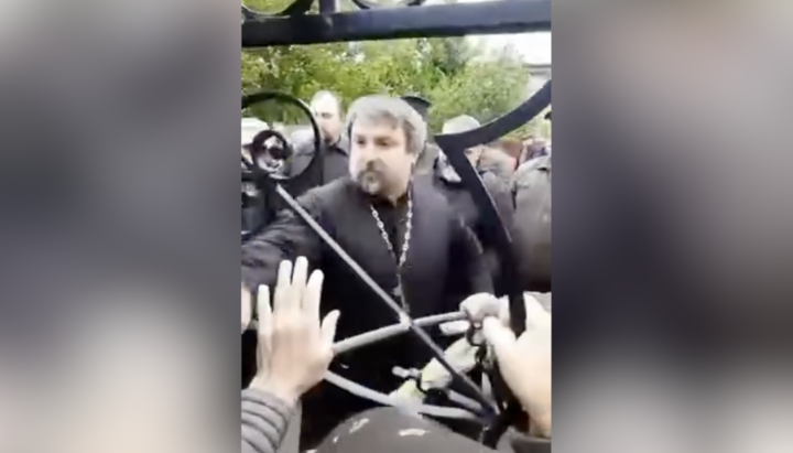 Він стоїть на чолі озвірілого натовпу, який з криками та улюлюканням топче, розштовхує та принижує бабусь-прихожанок храму УПЦ.