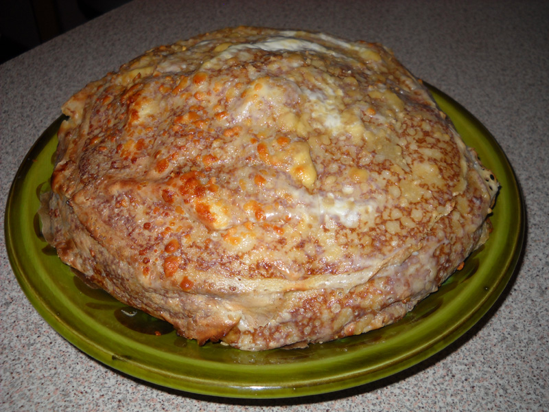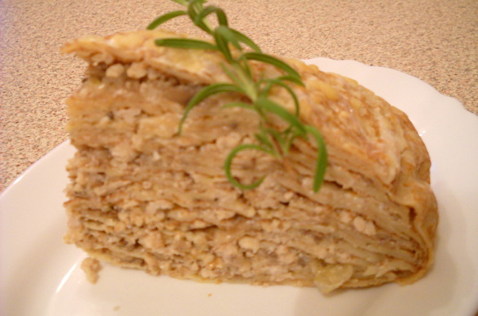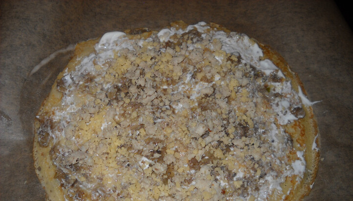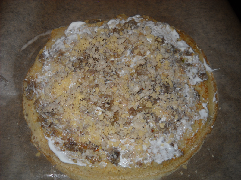 На деко кладемо лист паперу для випічки, змащуємо вершковим маслом, кладемо перший млинець, змащуємо його 1-1,5 ч. л. майонезу, потім ложкою рівномірно розподіляємо по млинцю гриби з цибулею (1-1,5 ч. л.). Далі кладемо другий млинець і повторюємо з начинкою.