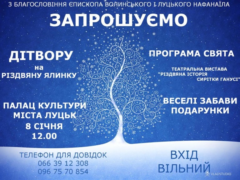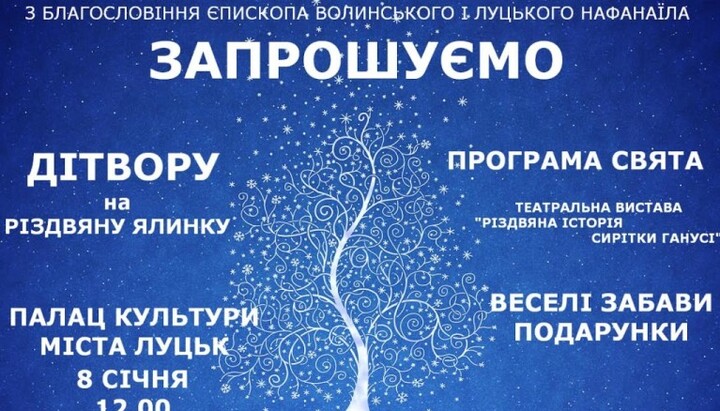 На Різдвяну ялинку запрошують до палацу культури міста Луцьк у найближчу після свята неділю, 8 січня. Організатор – Волинська єпархія УПЦ. Дітям покажуть виставу «Різдвяна історія сирітки Аннушки», також на них чекають ігри та подарунки. Початок о 12.00, вхід вільний.