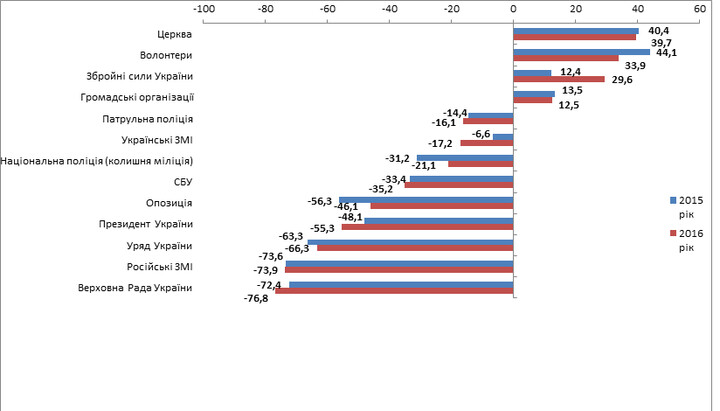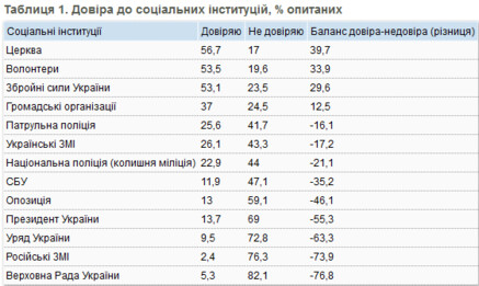 Крім Церкви, довірою серед українців користуються волонтери та збройні сили України, а найменшим ступенем довіри – уряд України і Верховна Рада України (цим інститутам довіряє менше 10% українців).