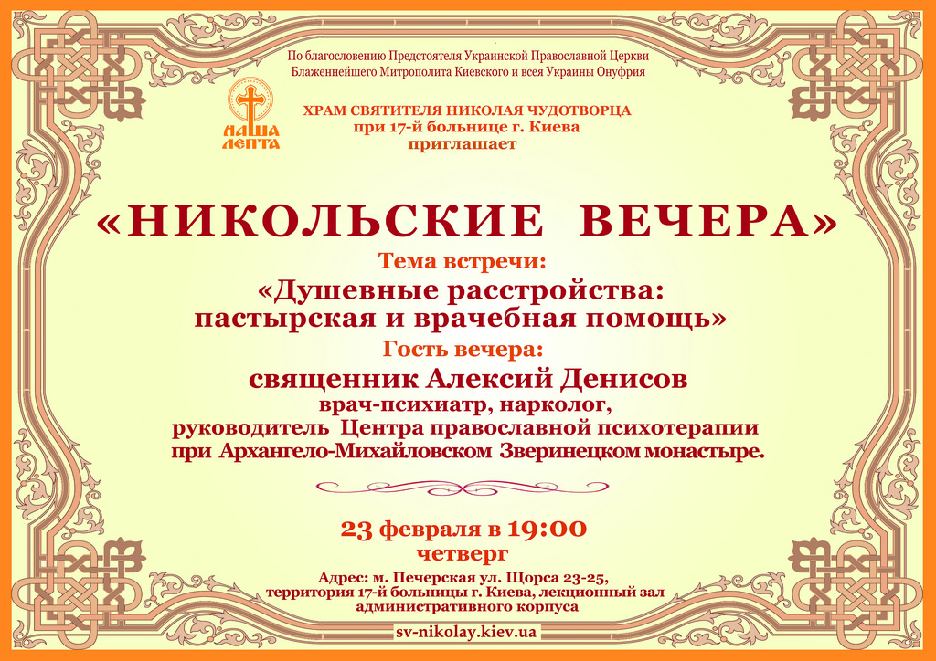 Перший «Микольський вечір» відбувся у лютому 2015 року і був присвячений темі Великого посту. Зустрічі проводять в лекційному залі адміністративного корпусу Київської клінічної лікарні № 17 (вул. Щорса, 23-25; станція метро «Печерська»).