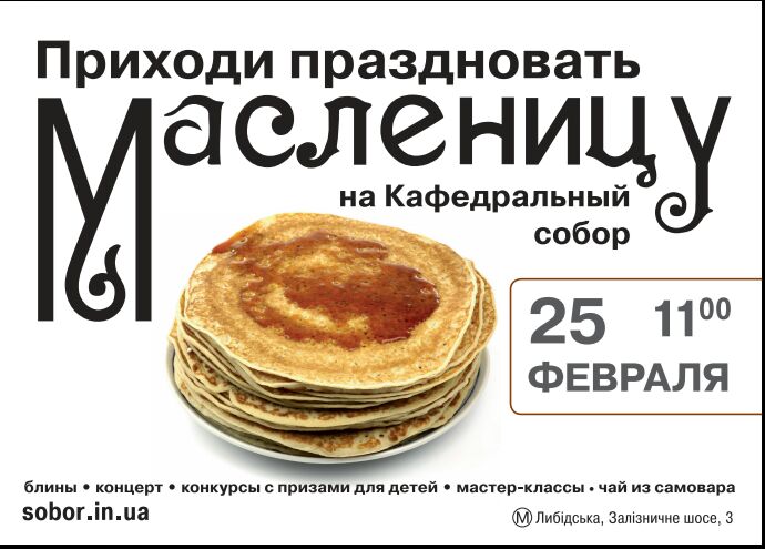 У програмі заходу – концерт, конкурси з призами для дітей, різні майстер-класи. Всіх гостей пригощатимуть млинцями та гарячим чаєм з самовара.