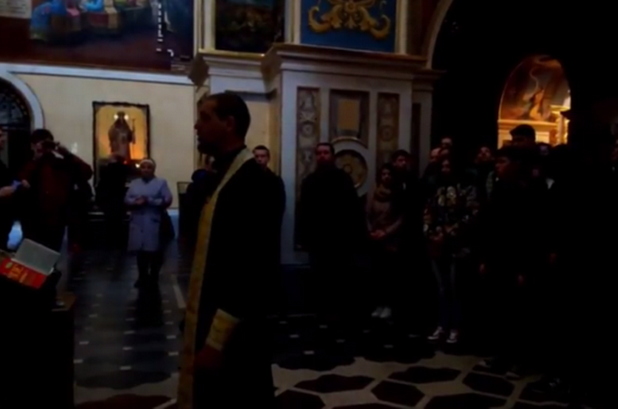 Представник УПЦ КП, «священик» Дмитрій, у супроводі 200 «волонтерів», що взяли участь у службі, приїхали в собор під приводом відвідування Національного Києво-Печерського історико-культурного заповідника.