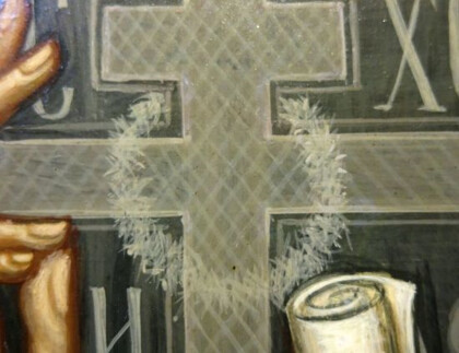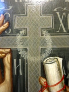 У той час на іконі став проявлятись «дефект» – почав проступати якийсь світлий круг в центрі хреста на одязі преподобного. Автор ікони припустила, що це проявляється сучок на дошці, що було категорично відкинуто столяром, оскільки сучків на дошці не було.
