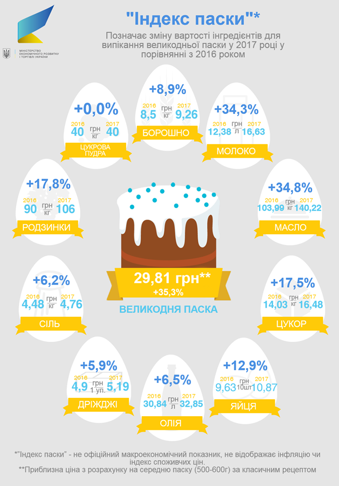 «Індекс паски» не є офіційним макроекономічним показником, не відображає інфляцію чи індекс споживчих цін. Всі розрахунки – приблизні, здійснені на основі моніторингу ДСС цін на соціально значущі товари та експертної оцінки Мінекономрозвитку.