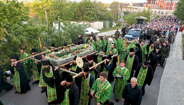 У супроводі великої кількості паломників з молитвами і пасхальними піснеспівами раку з нетлінними мощами пронесли навкруги Святої Гори до Пребраженского собору Лаври.