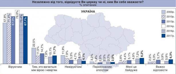 Невіруючими себе вважають 4,1% громадян, 2,5% – переконаними атеїстами. Про байдужість до релігійних питань заявили 8,2% респондентів, 6,3% вагалися з відповіддю.