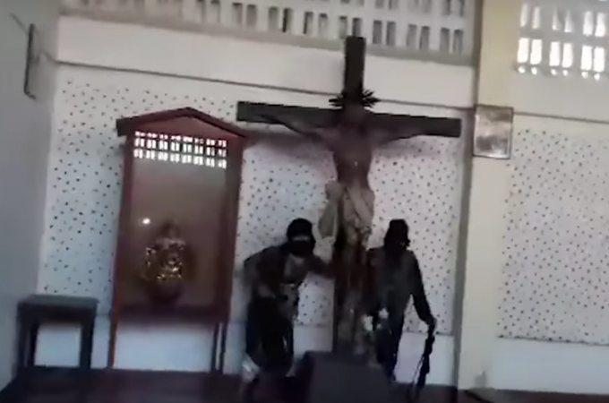 На відео терористи розбивають статуї та здійснюють підпал церкви.