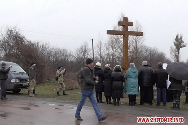 Освячення хреста розпочав митрополит Овруцький і Коростенський Віссаріон, коли під'їхали на кількох машинах активісти в камуфляжі та балаклавах.