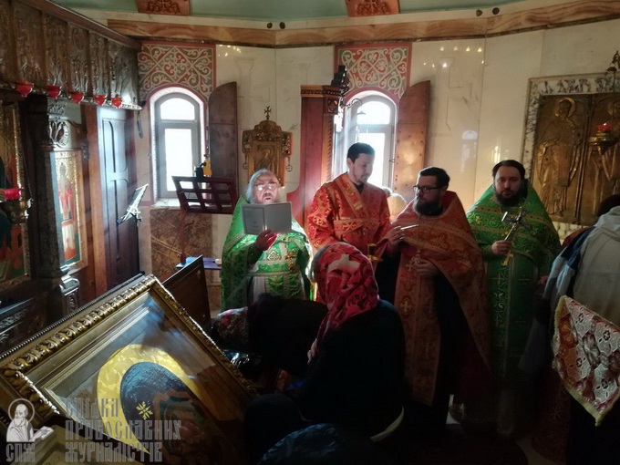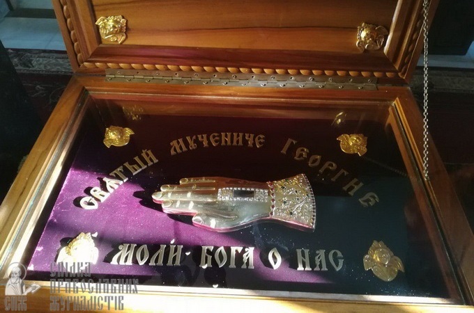 Була відслужена Божественна літургія, яку очолив ігумен монастиря архімандрит Гедеон (Харон). Люди молились, сповідались та причащались Святих Христових Тайн. Під час внесення мощей в храм півчі співали величальну святому Георгію і Тропар, а саму раку з десницею встановили в центрі храму поруч з вівтарем.