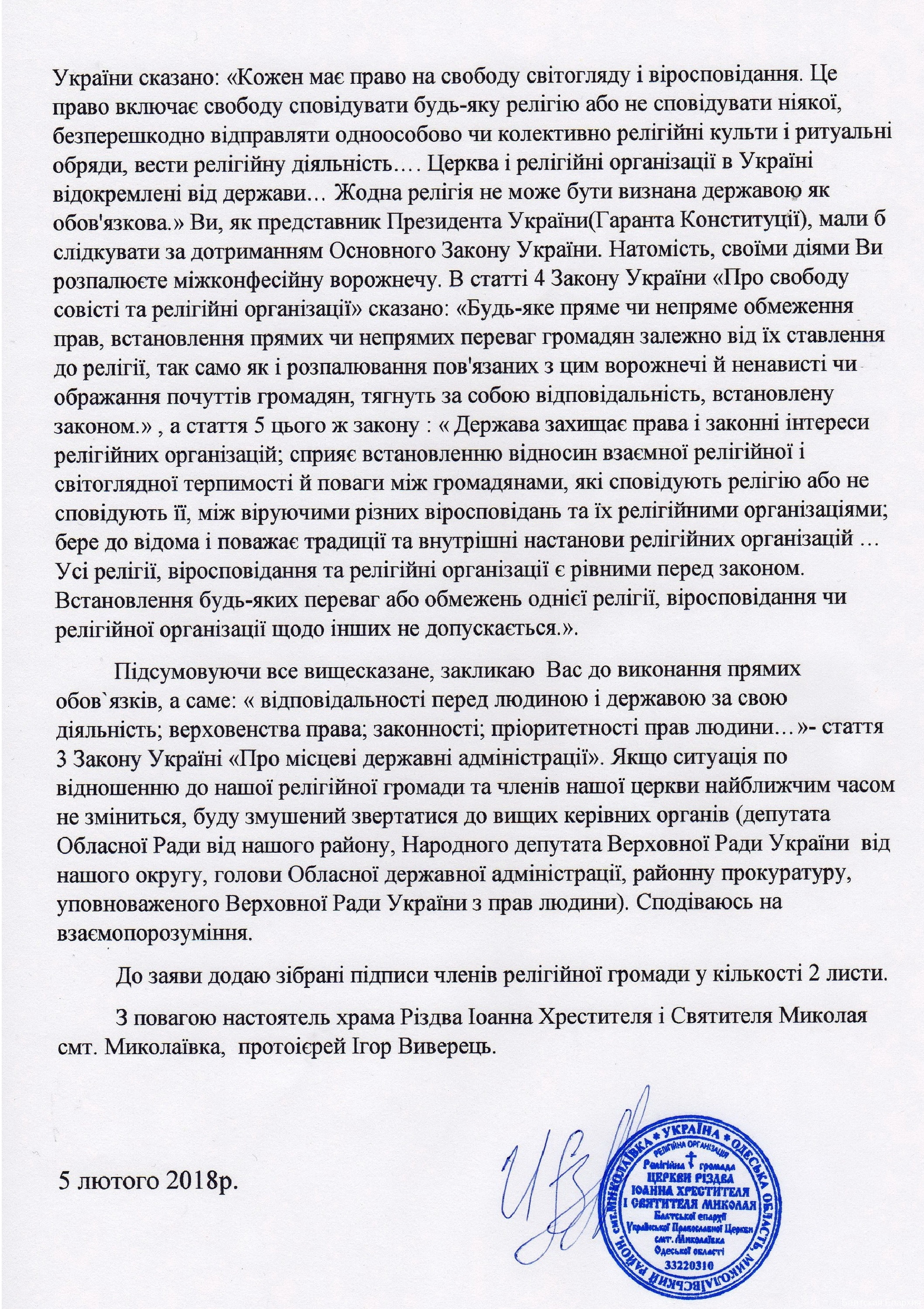 «Я все частіше стаю свідком порушень прав віруючих нашого селища. На урочистих заходах в смт Миколаївка присутні лише представники однієї релігійної організації – Української Православної Церкви Київського патріархату. Відомі факти, коли Ви викликали в свій кабінет і, під тиском своєї посади, вказували, в яку церкву людям ходити і як потрібно молитися», – пише священнослужитель.
