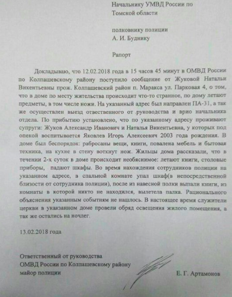 Інцидент стався в селищі Маракса Томської області. Жінка, за викликом якої приїхали поліцейські, поскаржилась на нез'ясовні явища – книги та столові прилади, що літають, шафи, що падають самі собою.