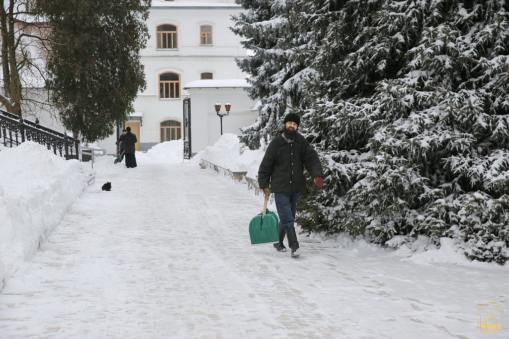 Незважаючи на снігові замети, життя з молитвою в обителі триває. Ченці та вірні розчищають весняний сніг.