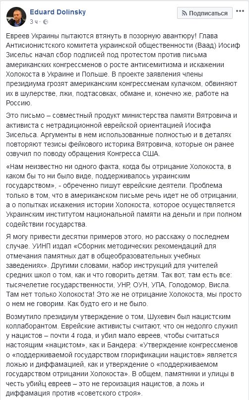 Заклики підписати послання Вааду до конгресменів США Едуард Долінський назвав спробою «втягнути євреїв України в ганебну авантюру».