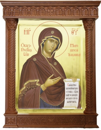 На іконі «Миропросительниця» Божа Матір зображена в молитві, з сувоєм у руці. Для сувою обрано відповідний напис: «Владико Багатомилостиве, Господи, благослови люди Своя миром». Перед цим образом особливо моляться про установлення миру і утвердження любові і єдності.
