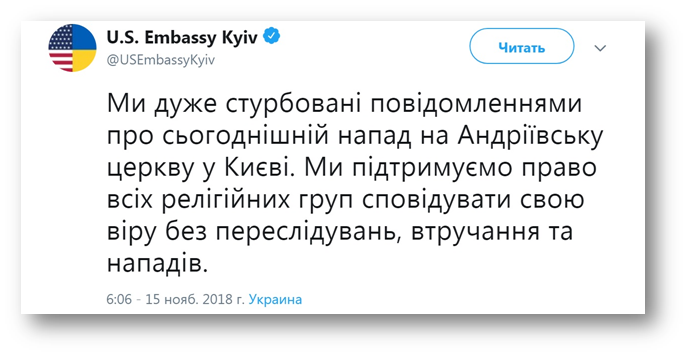 «Ми дуже стурбовані повідомленнями про сьогоднішній напад на Андріївську церкву в Києві. Ми підтримуємо право всіх релігійних груп сповідувати свою віру без переслідувань, втручання та нападів», – наголошується в повідомленні посольства.