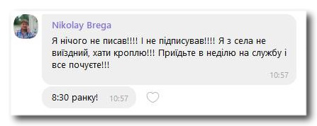 «Я нічого не писав!!! І не підписував!!! Я з села не виїзний, хати окропляю!!! Приїдьте в неділю на службу і все почуєте!!!» – йдеться в повідомленні священнослужителя УПЦ.