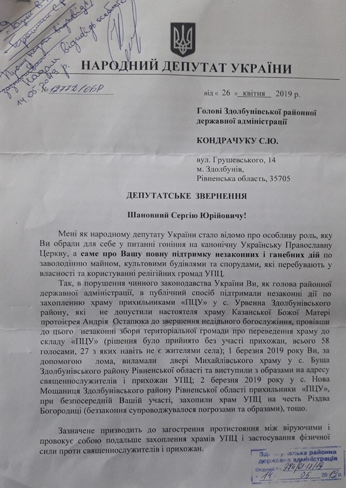 Народний депутат України Вадим Новинський направив голові Здолбунівської районної державної адміністрації Сергію Кондрачуку офіційне депутатське звернення, в якому закликав чиновника припинити утиски УПЦ і повернутися до виконання своїх безпосередніх обов'язків. Фотокопії офіційного звернення Новинського глава РДА опублікував у Facebook.