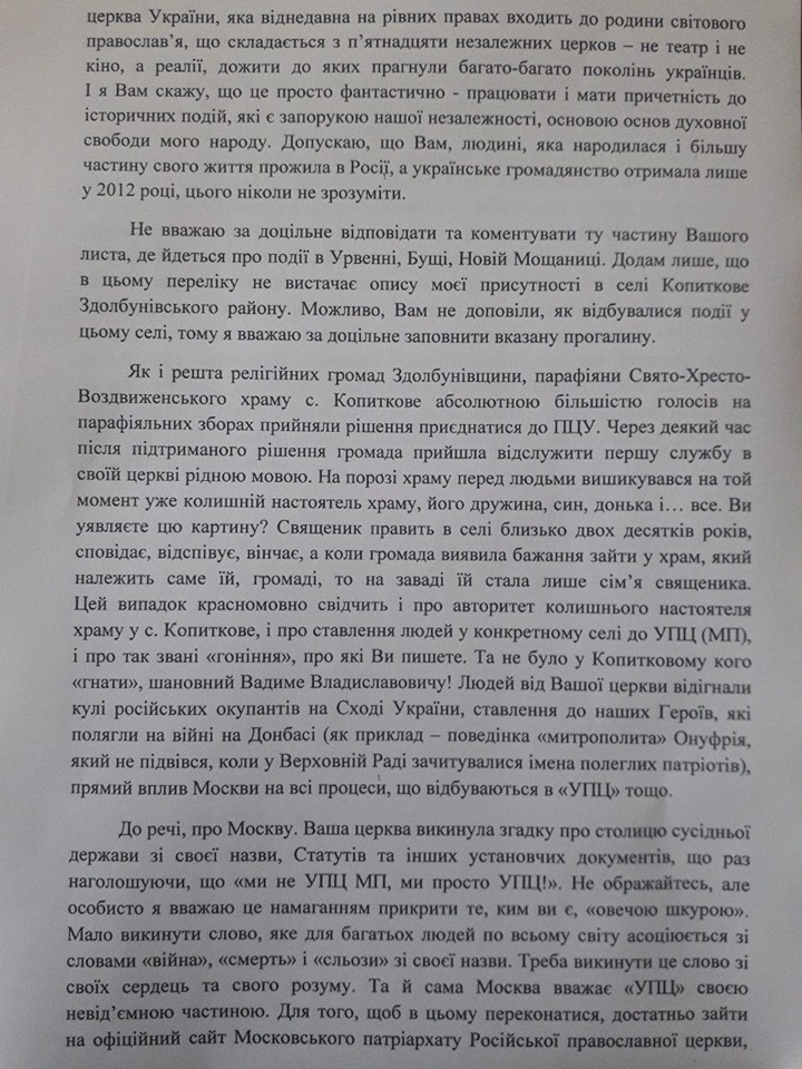 «На підставі статей 16, 17 Закону України «Про статус народного депутата України» звертаюся до Вас з вимогою надати мені конкретну відповідь щодо підстав та мотивів вчинення Вами незаконних дій щодо захоплення храмів та майна церковних громад Української Православної Церкви, образ та гонінь на священнослужителів і вірян УПЦ, – звернувся нардеп до Кондрачука. – А також закликаю повернутись у своїй діяльності в демократичне конституційне русло, дотримуватись у своїй діяльності Конституції та чинного законодавства України, в тому числі норм щодо свободи совісті та релігійних організацій в Україні, а також зосередитися на виконанні своїх безпосередніх обов'язків, спрямованих на вирішення господарських проблем регіону та соціального захисту громадян області».