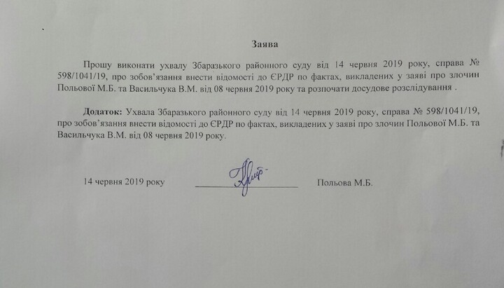 «Суд скаргу задовольнив, рішення суду тільки що подала в поліцію і чекаємо завтра забрати Витяг (з ЄРДР, – прим. ред.) з поліції, чекаємо початку досудового розслідування», – розповіла кореспонденту СПЖ член релігійної громади храму Мирослава Польова.