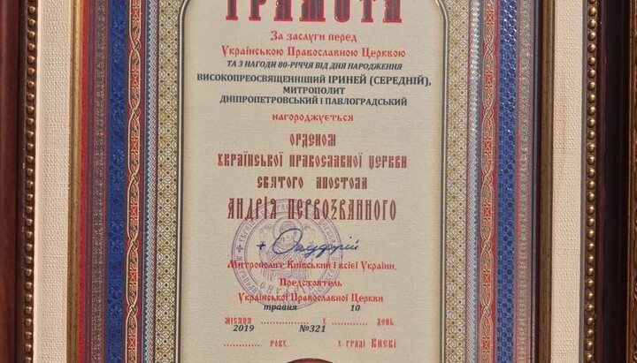 28 липня 2019 року Предстоятель Української Православної Церкви Блаженніший Митрополит Київський і всієї України Онуфрій вручив митрополиту Іринею високу церковну нагороду – орден святого апостола Андрія Первозванного, повідомляє прес-служба Дніпропетровської єпархії.