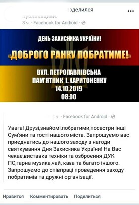 «Цей "захід до Дня захисника України", який було анонсовано в соціальних мережах, за повідомленнями організаторів, повинен була складатися з "виставки техніки і озброєння ДУК ПЦ, гарної музики, чаю, кави і багато чого іншого". Насправді ж весь "захід" очікувано склався в розміщенні провокаційних плакатів і включення на повну потужність гучномовців, через які звучали пісні образливого характеру для тих, хто зібрався для молитви», – йдеться в повідомленні прес-служби Сумської єпархії УПЦ.