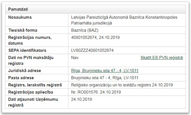 «Латвійську православну автономну церкву в юрисдикції Константинопольського патріархату» внесли в регістр підприємств Латвійської Республіки.