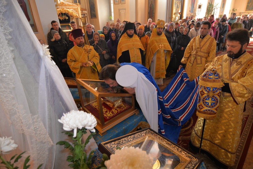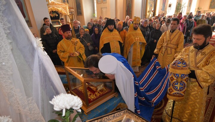 Митрополит Херсонський і Таврійський Іоанн (Сіопко) очолив хресний хід і вніс святиню в центральний приділ собору, де ковчег розмістили біля ікони Божої Матері «Всіх скорботних радість».