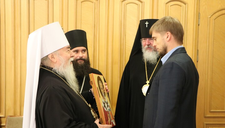 Митрополит Іриней привітав Олександра Бондаренка з призначенням на посаду губернатора області та подарував ікону святителя Миколая, архієпископа Мир Лікійських, чудотворця, а також книги, видані видавничим відділом Дніпропетровської єпархії.