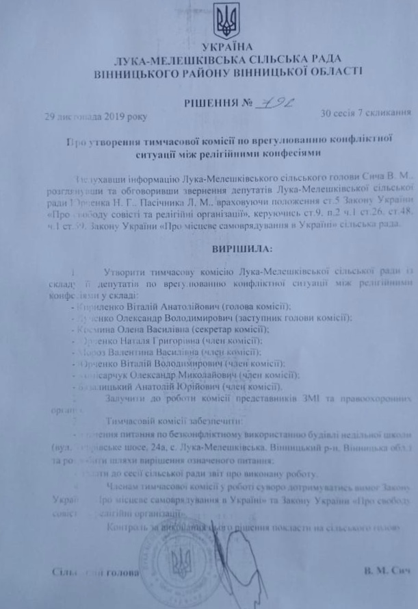 У селі Лука-Мелешківська Вінницької області під егідою голови сільської ради створили тимчасову комісію «із врегулювання конфліктної ситуації між релігійними конфесіями». Відповідне рішення сільради від 29 листопада 2019 року опублікувала прес-служба Вінницької єпархії УПЦ.